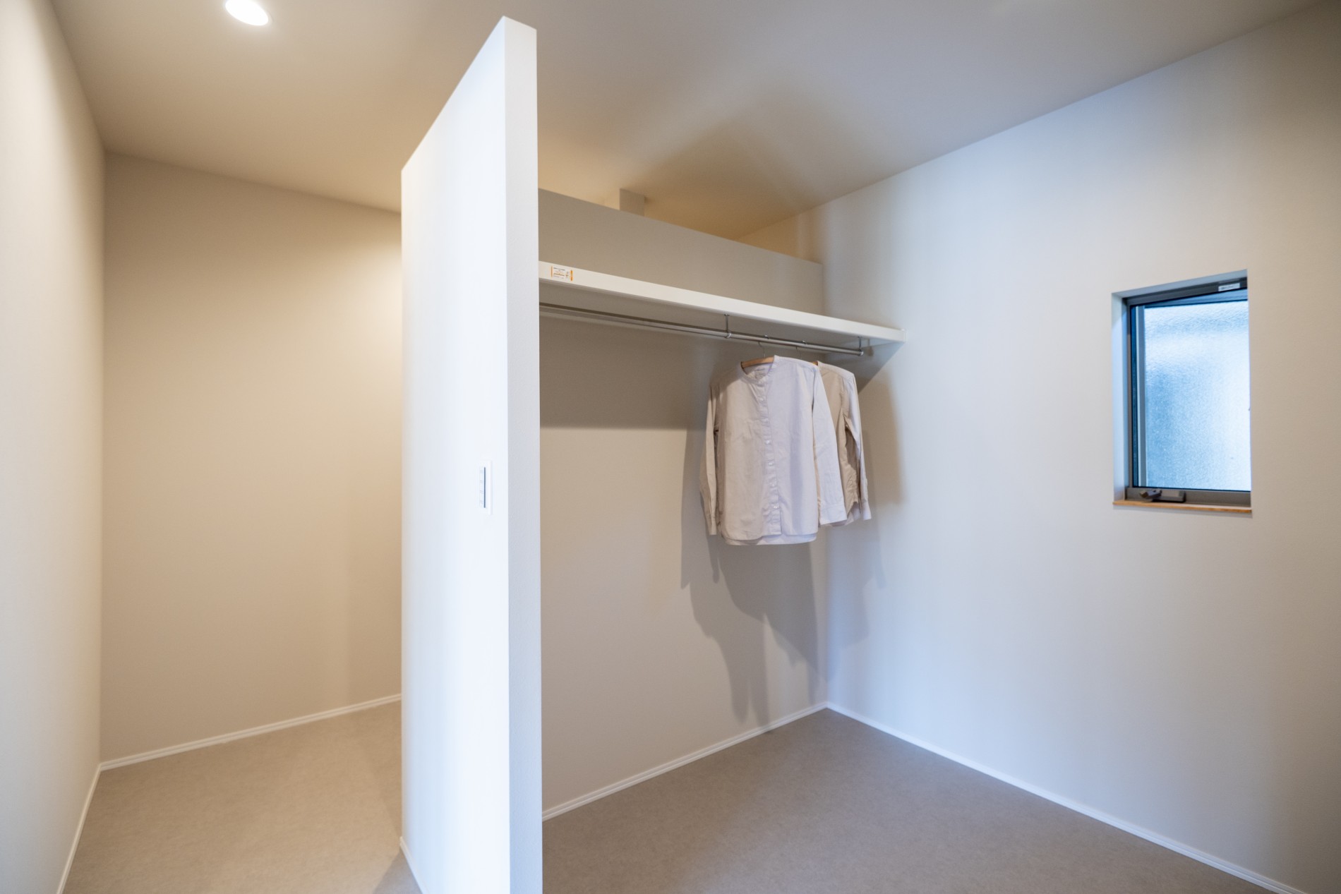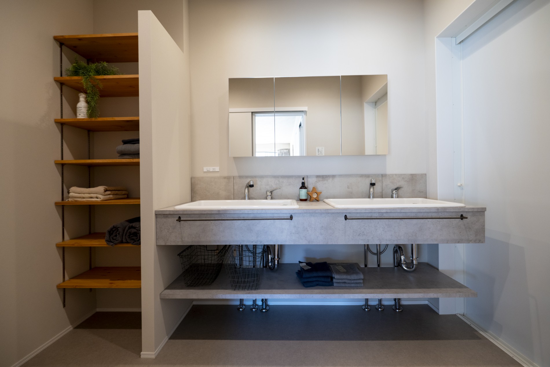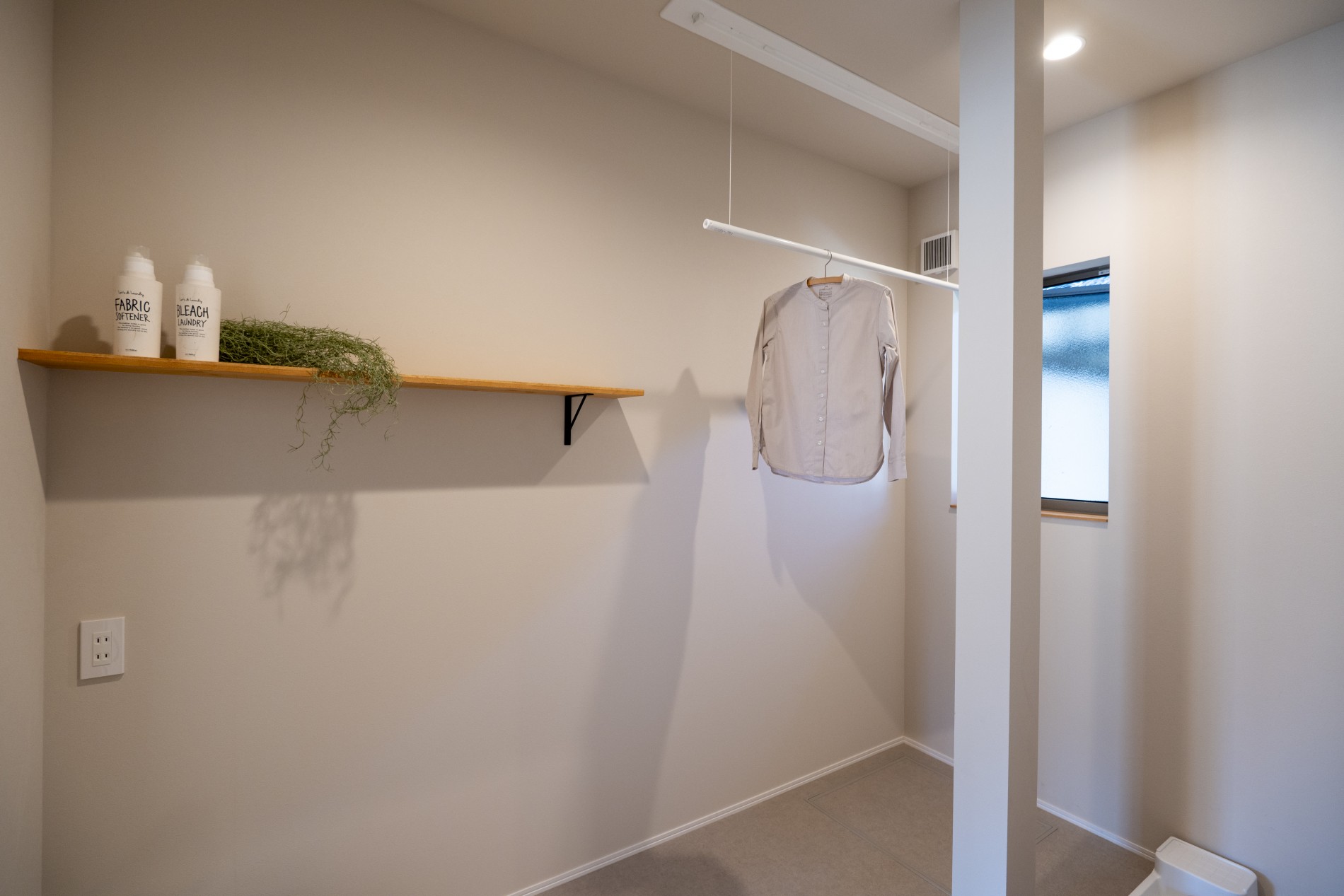 ランドリールームから浴室へとつながる回遊動線とファミリークローゼットが、