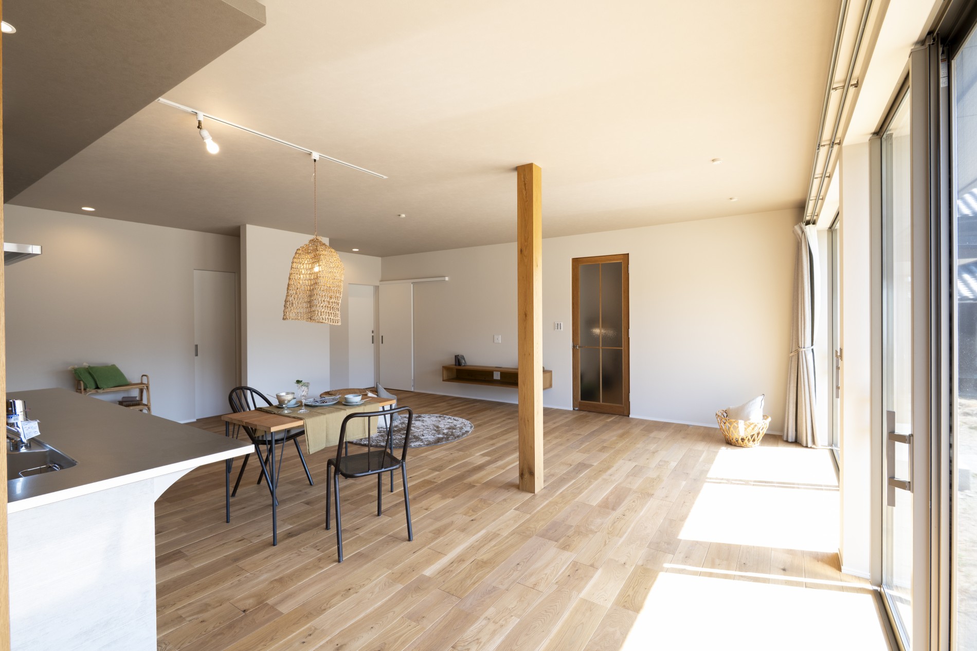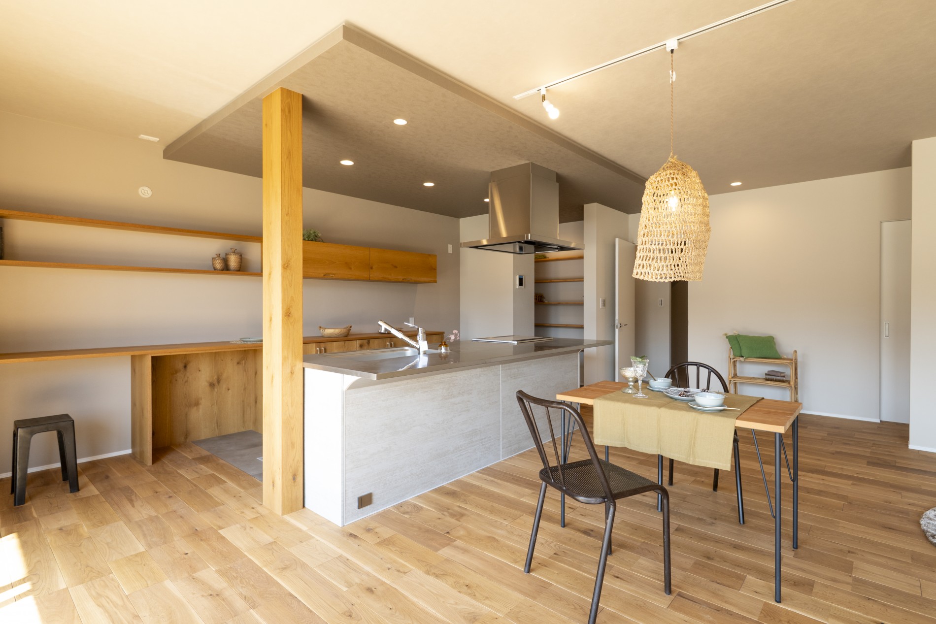 キッチンを中心に広がる空間は、家族の気配をほどよく感じながら過ごせる設計です。